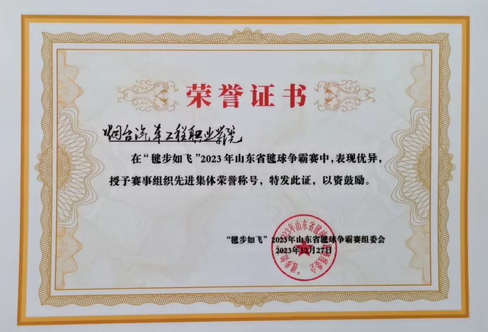 “毽步如飞”2023年山东省毽球争霸赛组委会授予机电工程系“向阳花”志愿服务队先进集体荣誉称号,充分肯定了比赛中志愿者们付出,感谢志愿者们助力比赛顺利举办。
