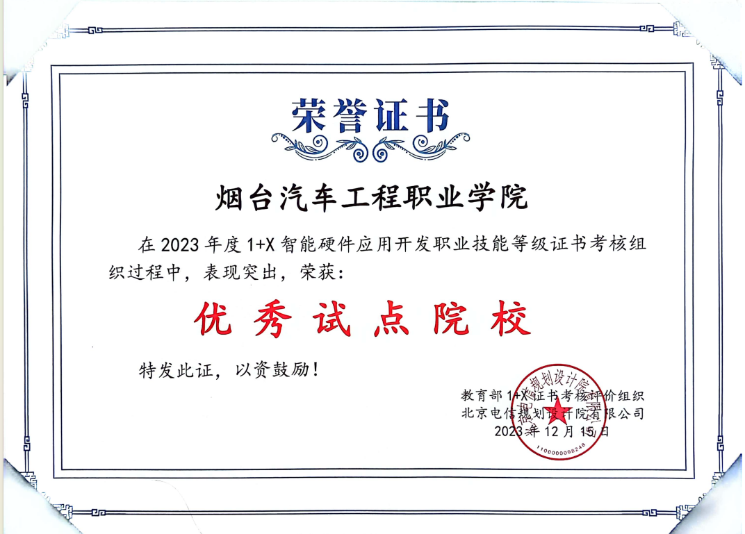 近日,教育部“1+X”证书考核评价组织——北京电信规划设计院有限公司在全国范围内遴选2023年度试点工作中发挥引领示范作用的优秀试点院校。我院在“1+X”智能硬件应用开发职业技能等级证书考核组织过程中表现突出,荣获“优秀试点院校”。