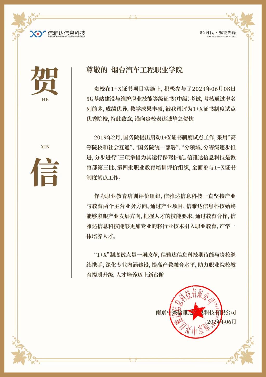 近日,由教育部指定的第三方评价组织——南京中兴信雅达信息科技有限公司在全国范围内遴选2023年度“1+X”证书试点工作中发挥引领示范作用的优秀试点院校。我院积极组织参与的5G基站建设与维护职业技能等级证书(中级)考核过程中表现突出,通过率名列前茅,教学成果丰硕,荣获“2023年度优秀试点院校”。至此,我院已连续三年荣获此项荣誉。