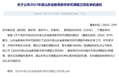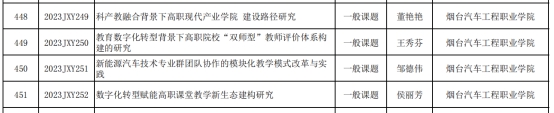 近日,山东省教育科学研究院发布了《2023年度山东省教育教学研究课题立项名单》的通知,确定立项重点课题35项、青年课题164项和一般课题550项,共计749项。学院提报的《新能源汽车技术专业群团队协作的模块化教学模式改革与实践》等4项课题获批立项。