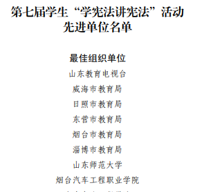 近日,省教育厅公布了第七届学生“学宪法讲宪法”活动开展情况的通报,学院荣获“最佳组织单位”,机电工程系张晨同学、电子工程系宋欣伟分别获高校组演讲比赛三等奖和知识竞赛三等奖,王志刚、邵虹等10名教师人获评先进个人。