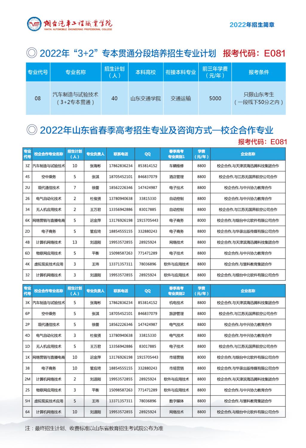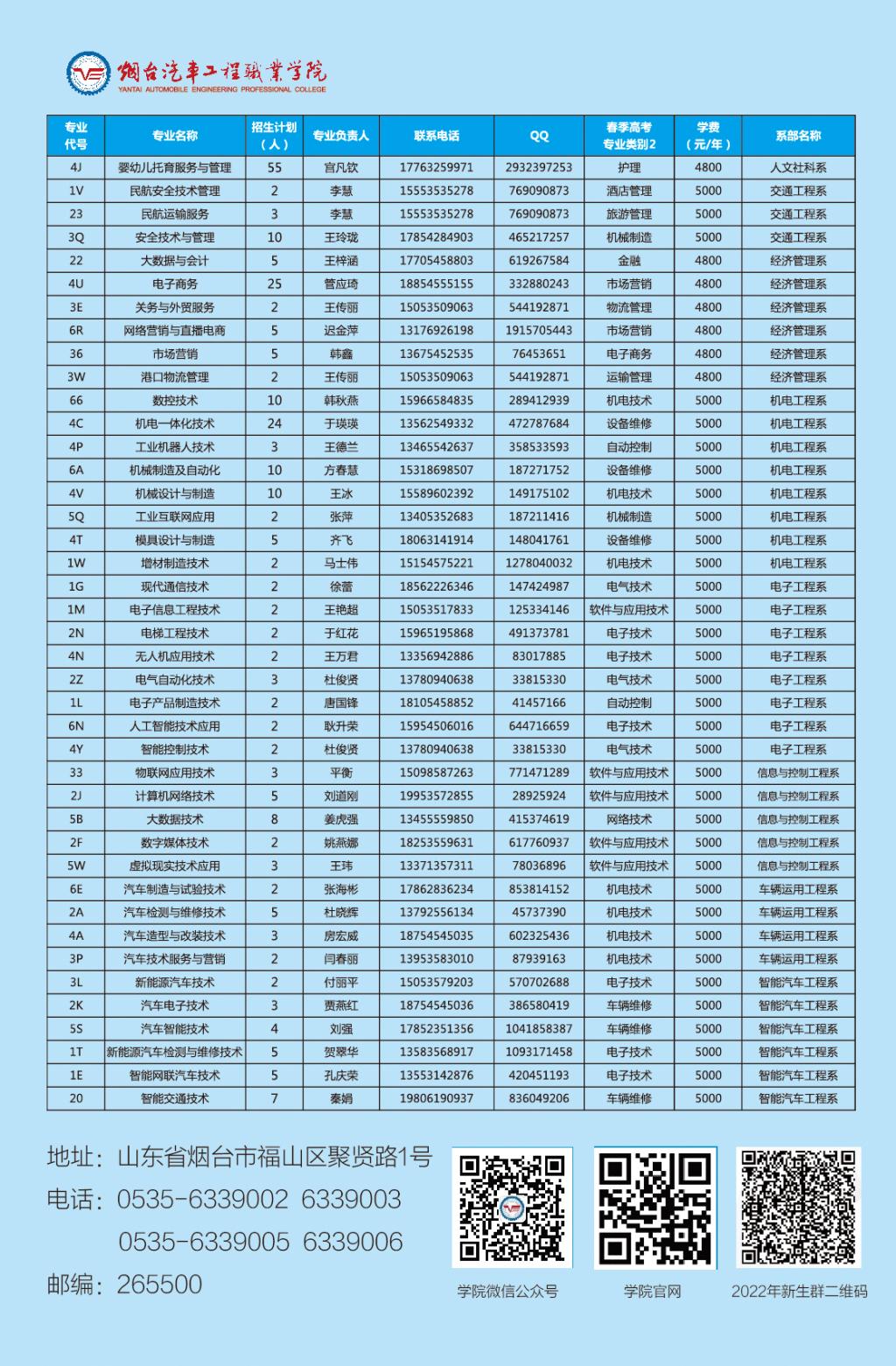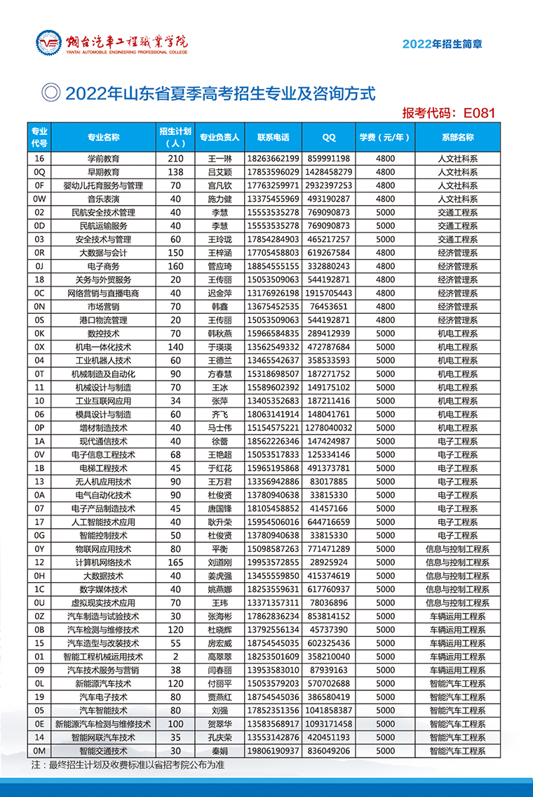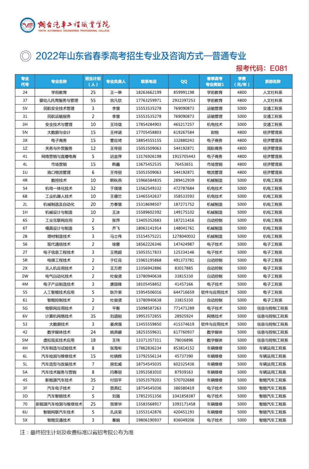 烟台汽车工程职业学院@山东高考生/2022年山东省夏季高考普通类招生计划